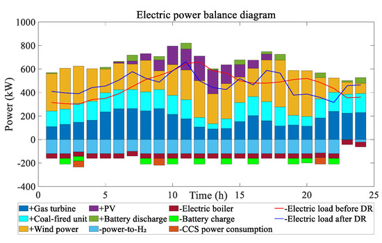 where is electricity purchased by the integrated energy system; is the output of coal-fired generation units (decision variable); and are the output of photovoltaic and wind turbine units, respectively (decision variables); is the electrical output of the CHP unit (decision variable); and are the charging and discharging power of the EES (decision variables); is the electric power absorbed by the electrolytic tank (decision variable); is the electric power consumed by the electric boiler (decision variable); is the electric power consumed by the CCS system (decision variable); and is the electric load at time t. is the thermal load at time t; and are the charging and discharging thermal power of thermal energy storage system (decision variables). is the amount of gas purchased by the system (decision variable); is the gas load. is the CH4 generated by P2G (decision variables); and are the Hydrogen charging and discharging volumes of the HES system (decision variables).