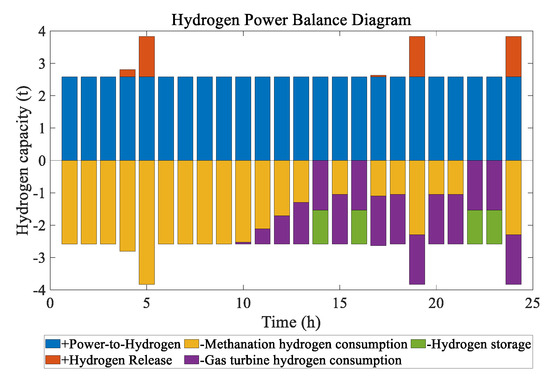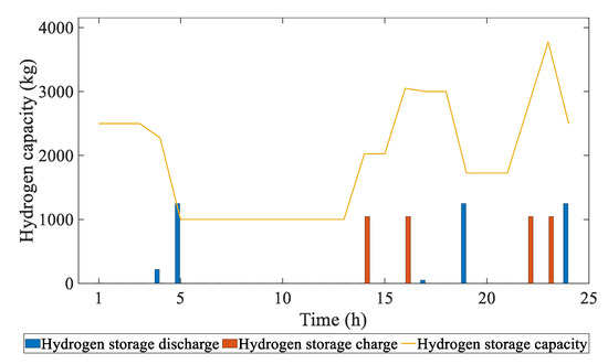 Hydrogen storage demonstrates a threefold value: renewable absorption, energy conversion, and low-carbon benefits. It absorbs excess electricity during low-price or curtailed periods through hydrogen production, achieving energy vector transformation and generating terminal value via external sales or process substitution. Additionally, replacing carbon-based fuels with hydrogen contributes directly to emission reductions. Figure 10 and Figure 11 present the optimised scheduling results for hydrogen energy storage. In Scenario 5, the independence and scaling-up of hydrogen storage further enhance its arbitrage and low-carbon benefits, significantly improving the local utilisation of renewables and the temporal matching between generation and load.