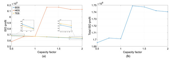 We scale the rated capacities of the three storage types—electrical (EES), thermal (TES), and hydrogen (HES)—by factors {0.50, 0.75, 1.00, 1.25, 1.50,1.75, 2.0}, re-solve the model for each case, and extract the ISO profit of each storage as well as the sum across the three technologies. Figure 12a shows per-technology ISO profit vs. capacity factor. HES exhibits a pronounced knee around 1.0–1.25×: profit surges when the capacity passes this threshold and then slightly tapers, suggesting that a binding constraint along the P2G-H2 utilisation-CCS chain is relaxed. In contrast, EES/TES display nearly flat or gently declining trends, implying that their limits are non-binding under the current price signals and coupling settings. Figure 12b plots the total ISO profit (EES + TES + HES), which increases markedly up to near 1.25 and then shows diminishing returns. Practically, this identifies 1.0–1.25 as a reasonable sizing range for storage expansion in the industrial-park case, while further expansion delivers smaller incremental value.