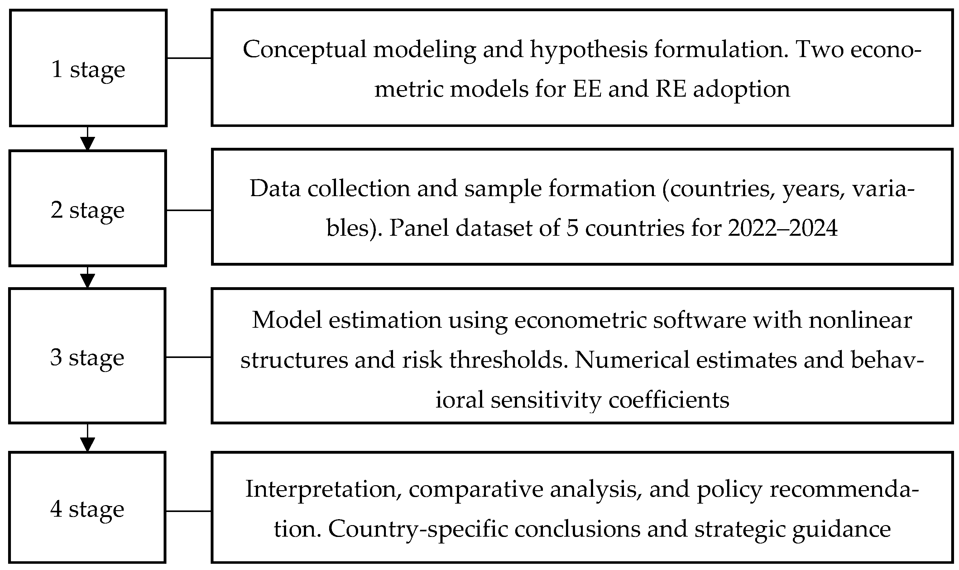 Beyond methodological replication, this study contributes two distinctive novelties. First, it introduces a risk-adjusted financial mechanism framework that quantifies how behavioral uncertainty modifies the elasticity of household energy responses. Second, it applies cross-national micro-comparative modeling to five countries with sharply different institutional risk settings—something rarely performed in household-level energy efficiency studies. Although the statistical panel (2022–2024, five countries) is intentionally concise, it captures the post-crisis transition period, when energy policy shifts were most intense, yielding high-frequency behavioral signals that are valuable for policymakers. Therefore, the paper’s significance lies not in sample size but in integrating behavioral risk and financial incentives within a short-term, real-time transition context.