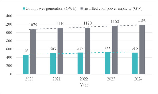 A stable electricity supply is a critical foundation for national economic development, societal advancement, and the maintenance of civilian livelihood. As evidenced by statistics from the National Energy Administration (2020–2024), China’s coal-fired power capacity has demonstrated persistent growth, with annual increments illustrated in Figure 1.