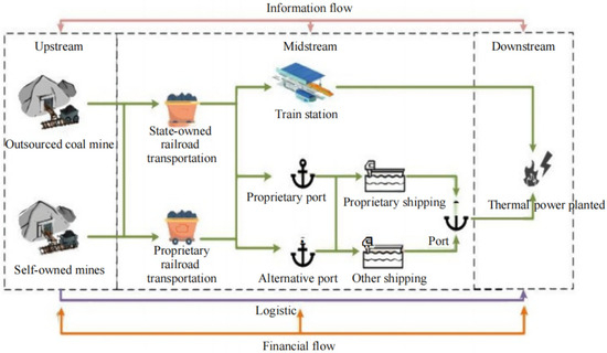The thermal coal supply chain constituted a complex network system spanning from coal extraction to power transmission. It principally encompasses three primary segments: coal supply (upstream), transportation (midstream), and power-plant operation (downstream). In the upstream segment, coal-mining enterprises can be classified as self-owned mines and outsourced coal mines based on the extraction methodology. The midstream segment pertains to thermal coal logistics and transportation enterprises, which are categorized by transportation mode into road transportation, inland maritime and inland-sea shipping, imported coal shipping, railroad transportation, and others. The downstream thermal power planted serve as the consumption terminus of thermal coal and represent the ultimate link within the thermal coal supply chain. The upstream, midstream, and downstream links of the thermal coal supply chain and their interactive relationships are visually presented in Figure 2.