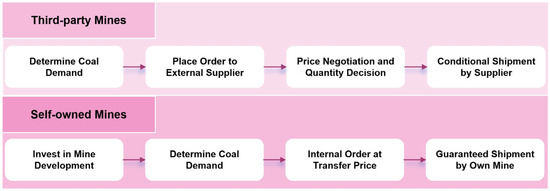 Domestic coal supply pertained to the upstream coal-production echelon, encompassing both self-owned coal mines and procured coal mines. The procurement of domestic coal within the context of coal–power integration was chiefly bifurcated into two components: issuance of thermal coal orders to self-owned coal mines, and placing orders with other domestic coal mines. The differences in procurement procedures between self-owned coal mines and outsourced coal mines are detailed in Figure 3, including key nodes such as order issuance, production scheduling, and quality inspection: