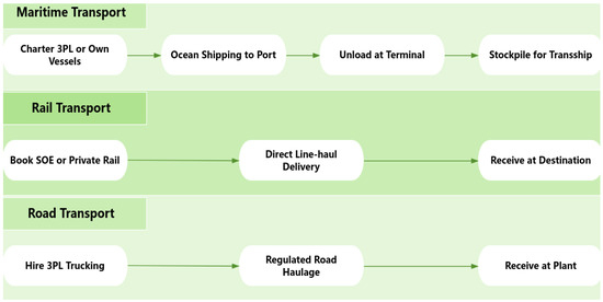 The midstream logistics of China’s thermal coal supply chain constitute a multimodal transportation system that transfers extracted resources from mining pits to demand centers. Current transportation modalities include roadway, railway, and maritime networks. Railway transport dominates the national coal logistics framework, supplemented by coastal/riverine shipping, while roadway transport serves primarily as last-mile connectivity. The main operational processes of thermal coal road transportation are shown in Figure 5.