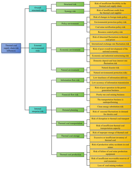 By synthesizing the risk factors identified in prior studies (Table 1), this study further incorporated the industry-specific characteristics of coal–power integration (e.g., internalized supply chain collaboration, cross-link coordination between coal mining and power generation). Specifically, we supplement risks related to power generation operations (e.g., poor operation in the power generation business) and supply chain structural rigidity (e.g., insufficient flexibility in the thermal coal supply chain), which were rarely addressed in previous research focused on single-segment coal enterprises. This integration results in a comprehensive list of 28 risk factors, categorized into internal operational risk, external environmental risk, and overall structural risk, as illustrated in Figure 7.