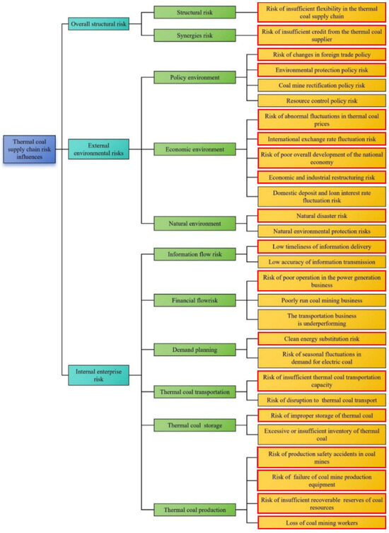 On the premise of maintaining the second-level risk factors, the third-level risk factors were filtered by retaining those with an average token number below the 25th percentile of all simulated values. This threshold was selected to identify factors with high independence and primary influence within the risk network. While preserving the hierarchical structure of risk factors in coal–power linkage and based on the simulation outcomes of the Petri net, the indices of the third-level factors that were less affected by other factors were selected. That is, among the third-level risk factors under each second-level factor, those with a small average token number were chosen. Subsequently, the key risk factors of the thermal coal supply chain were determined, as presented in Figure 9. Compared with traditional risk analysis methods such as Fault Tree analysis [4], which focuses on static logical relationships, the Petri net model in this study effectively captures dynamic risk propagation (e.g., the cascading effect of ‘Natural disaster risk’ on transportation and production links). This advantage aligns with the findings of Qin [7] who emphasized the value of Petri nets in simulating asynchronous events, but our study further tailors the model to the thermal coal supply chain by incorporating industry-specific risks (e.g., coal mine rectification policy risk) that were overlooked in general logistics research [9]. Additionally, unlike previous studies on coal supply chains [14,16], which focused on single-risk dimensions (e.g., price fluctuations), our identification of 18 key factors (including structural risks such as ‘Insufficient flexibility in the supply chain’) provides a more holistic perspective for resilience optimization.
