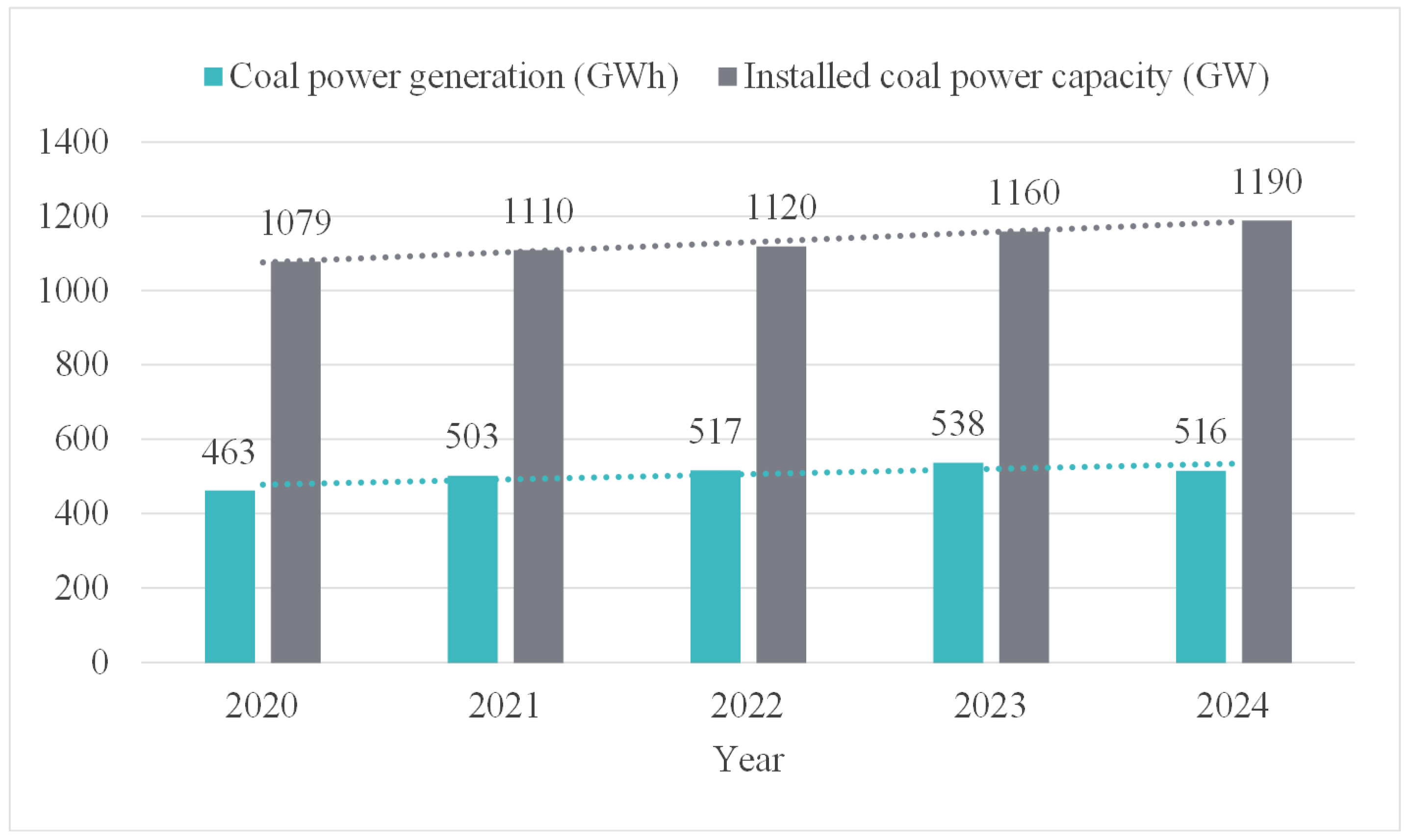 Figure 1. Trend of national coal power generation and installed capacity, 2020–2024.