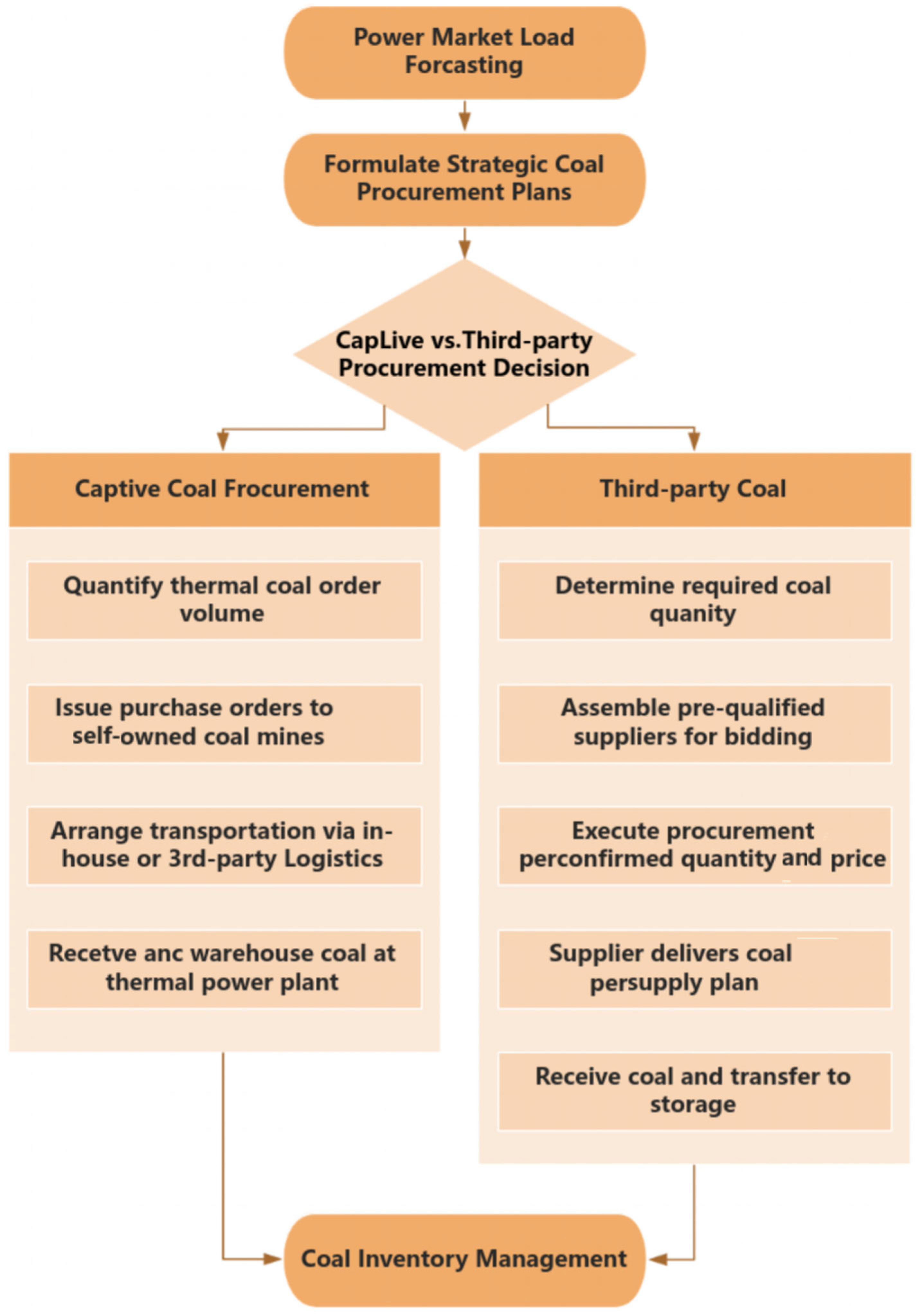 The downstream operational architecture of the thermal coal supply chain constitutes a demand-driven procurement system. Within this system, coal–power integrated operators formulated strategic coal procurement plans through power market load forecasting models, followed by material flow execution encompassing supplier selection and inventory management. This system bifurcated into captive coal procurement and third-party coal sourcing mechanisms, each exhibiting distinct operational paradigms (as shown in Figure 6).