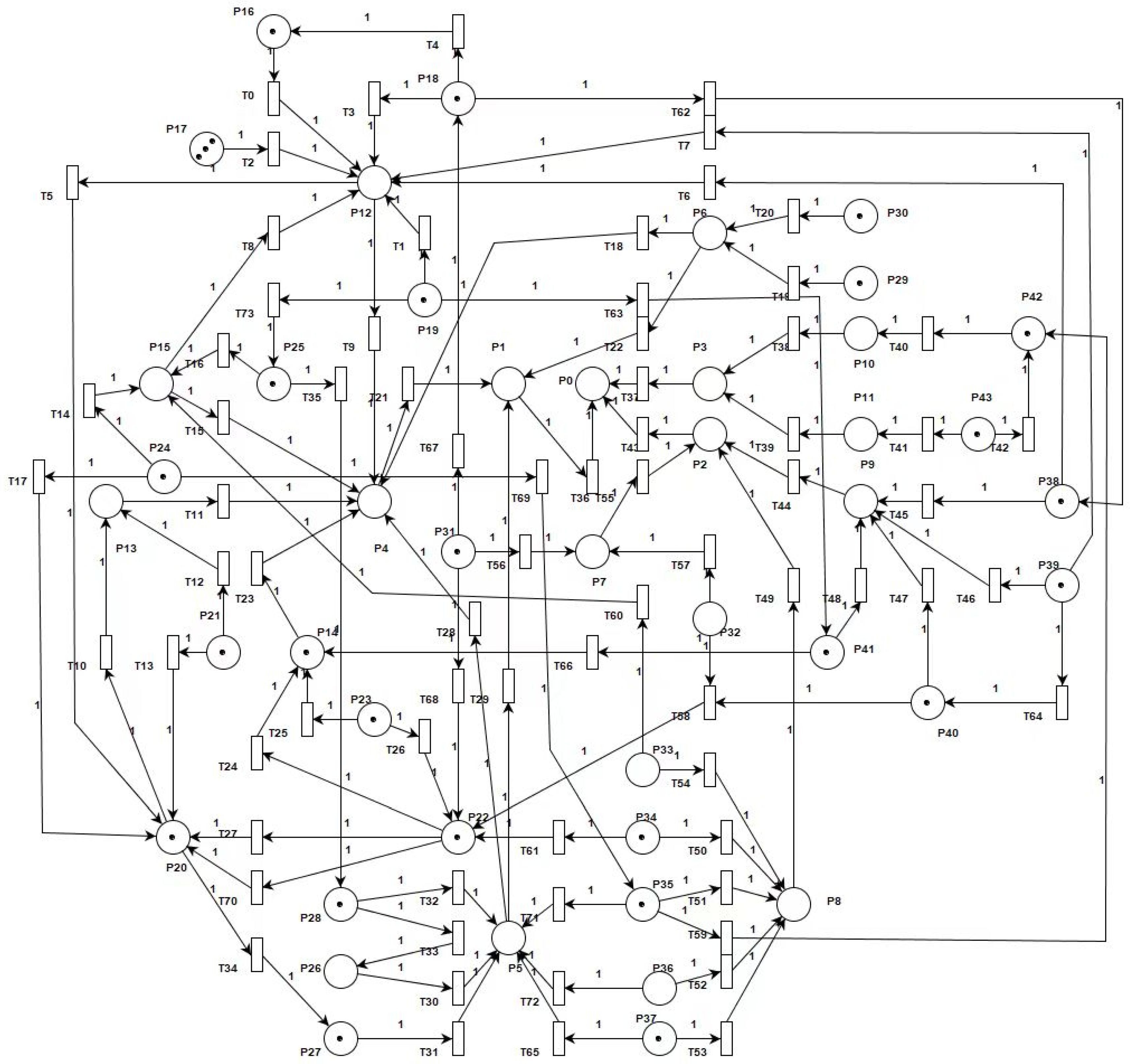 Petri net components, as defined in [21], consist of the following elements: tokens, which symbolize system resources; places (p), serving as repositories for resources; transitions (t), representing events that initiate the flow of resources; and directed arcs, depicting the pathways through which resources move upon the activation of transitions.