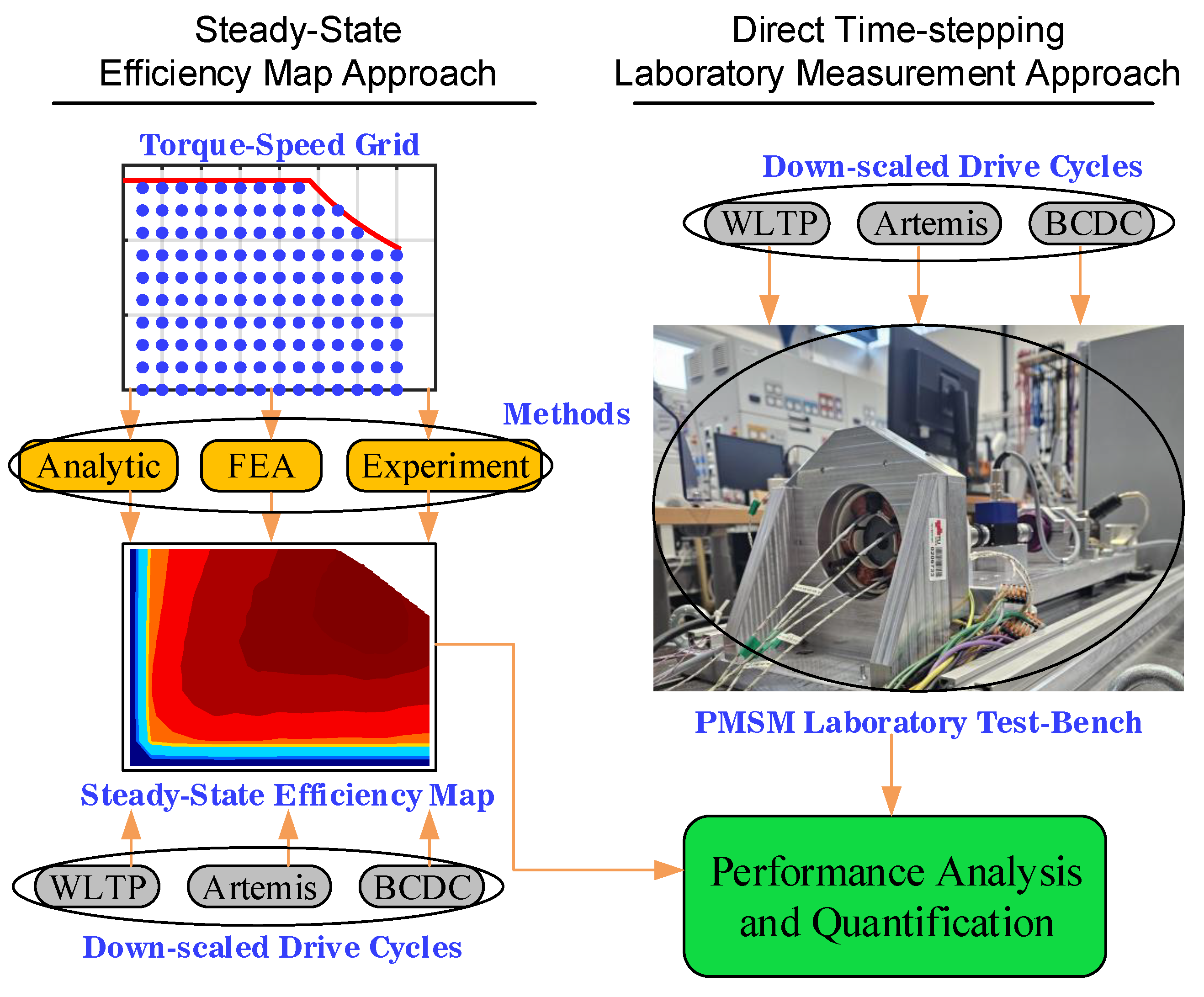 Two distinct study approaches as shown by the flowchart in Figure 1, are used: a LUT-based efficiency map approach and a direct time-stepping transient measurement approach. The following sections provide a detailed discussion of both approaches.