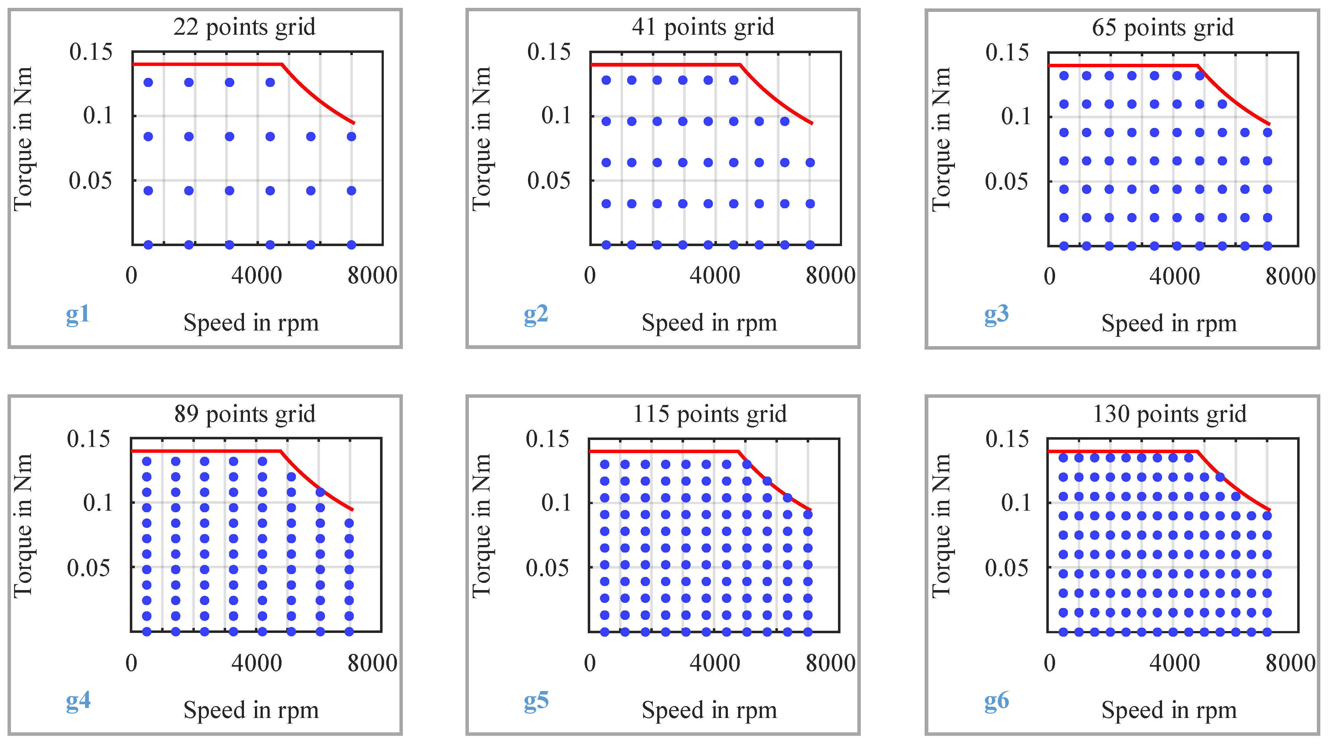 This approach usually starts with the selection of different torque–speed grid points (grid density) that are simulated (either analytically or with FEA) or experimentally measured [26,29,40,41]. Evenly distributed grid points are considered with torque points between 0 Nm and 0.14 Nm and speed points between 500 rpm and 7100 rpm. Six different grid densities are considered for the analysis as shown in Figure 2. It should be noted that only the grid points that fall under the operational capability ( T max , P max ) of the laboratory test bench are considered. For simulation-based approaches (a detailed description of each model is provided in the following; see Section 2.1.1 and Section 2.1.2), associated losses and mechanical output power are computed for each OP, and the efficiency at that OP is calculated as defined in (1) [42,43,44]. It is important to note that, for operating points in the generating region (i.e., negative torque and positive speed), the definitions of input and output power are reversed, and the efficiency has been calculated accordingly. In the following sub-sections, different methods for efficiency map approach are explained.