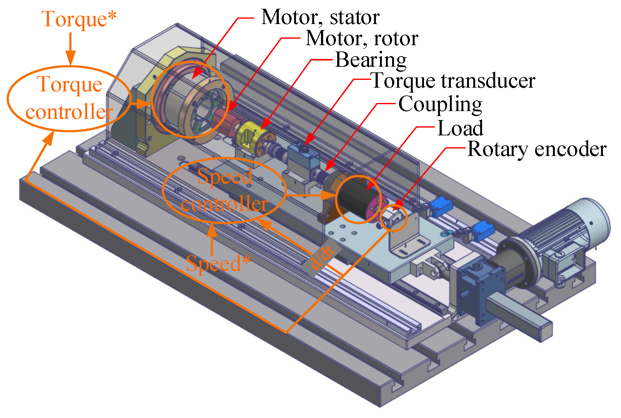 Figure 4. A 3D schematic of the PMSM laboratory test bench. The orange lines represent the simplified control schematic. The system integrates both efficiency-map-based computations and direct time-stepping laboratory measurements. The motor under test is torque-controlled and the load motor is speed-controlled. * denotes that the values are commanded.