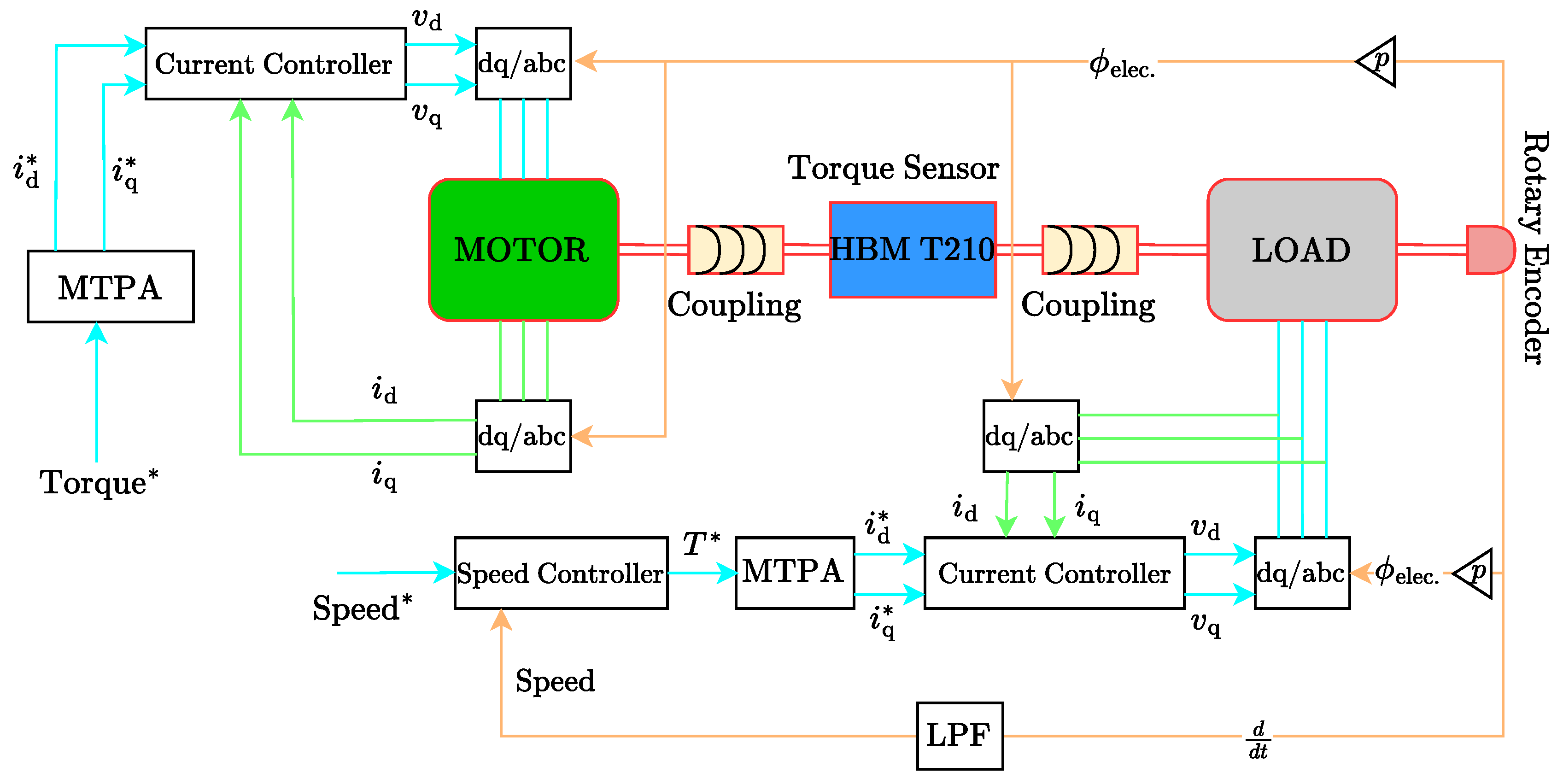 Figure 5. Complete control block diagram of the PMSM laboratory test bench used for drive cycle time-stepping measurements. Real-time control, data acquisition, and torque–speed profile tracking are implemented to ensure accurate replication of drive scenarios. The speed in fed back using a low pass filter (LPF) with a time constant of 4 ms . * denotes that the values are commanded.