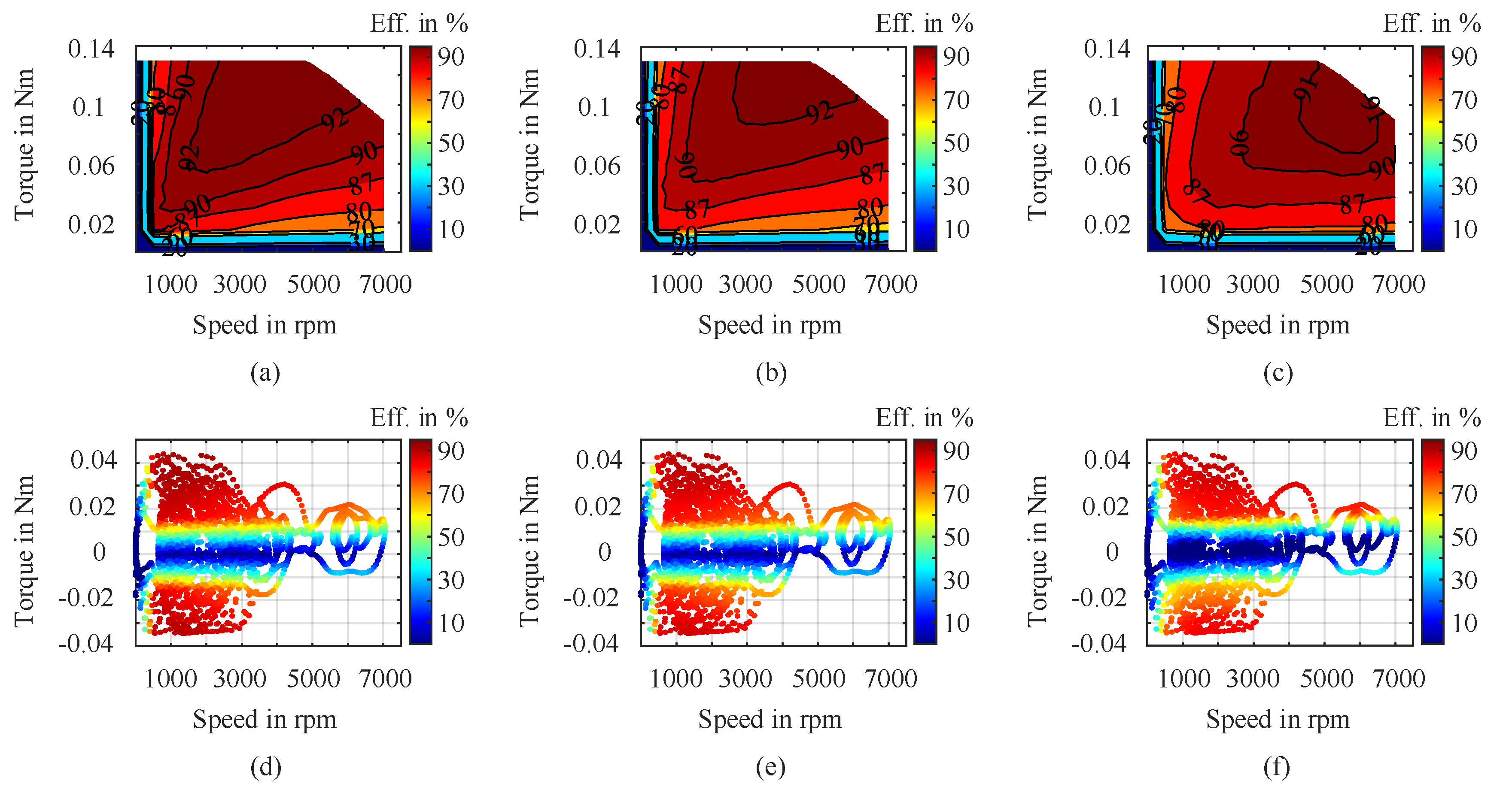 Figure 6. Efficiency maps and corresponding efficiency plots of the PMSM during down−scaled WLTP drive cycle OPs (with BMW i3), determined from steady−state LUT−based analysis: (a,d) through FEA model, (b,e) through analytic model, (c,f) through experiment; interpolations are based on the 130−point grid (g6) for each map.