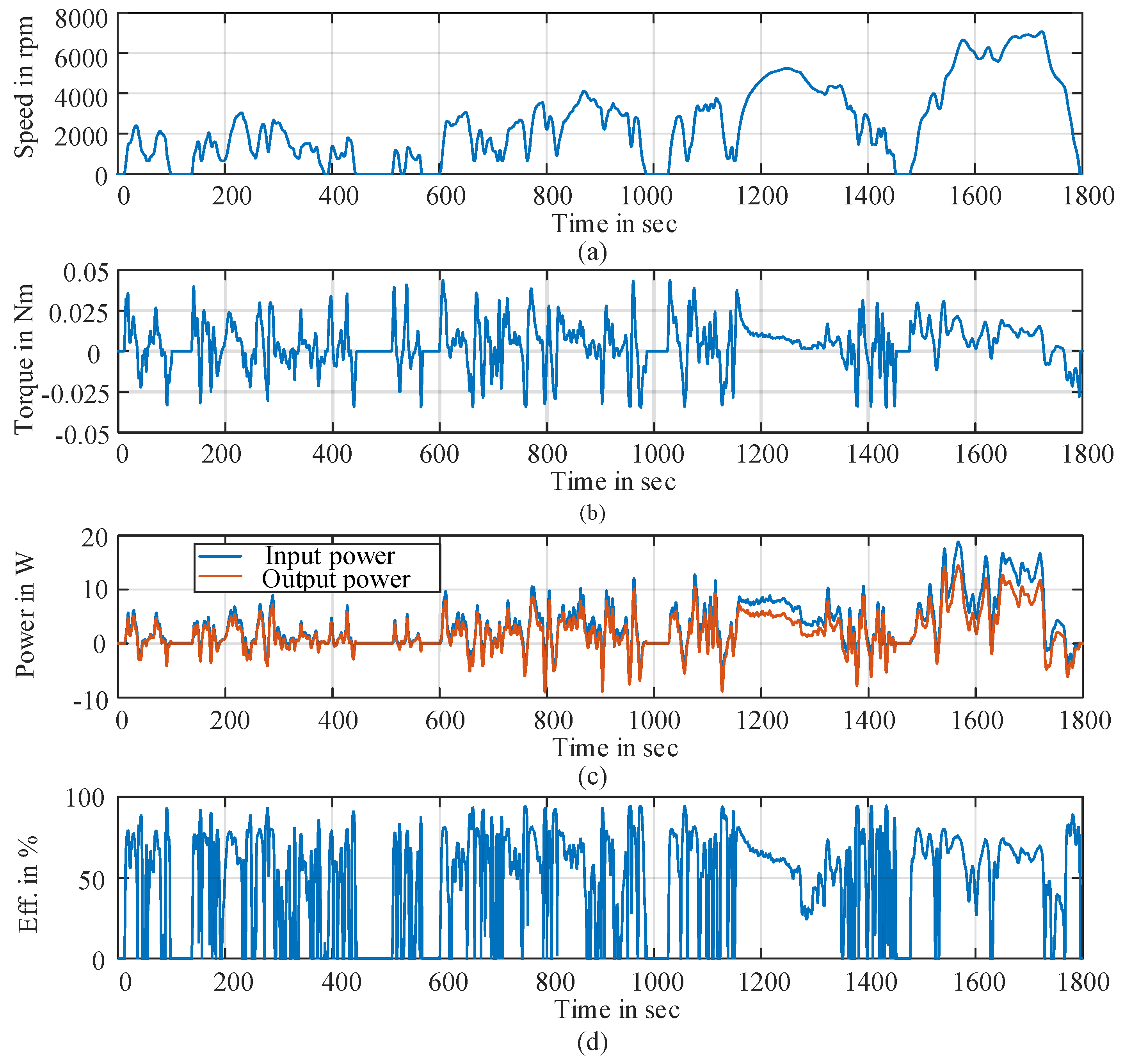 Figure 8. Laboratory measurement results of full down-scaled WLTP drive cycle (with BMW i3): (a) speed−time profile, (b) torque−time profile, (c) input and output power−time profiles, (d) calculated efficiency-time profile.