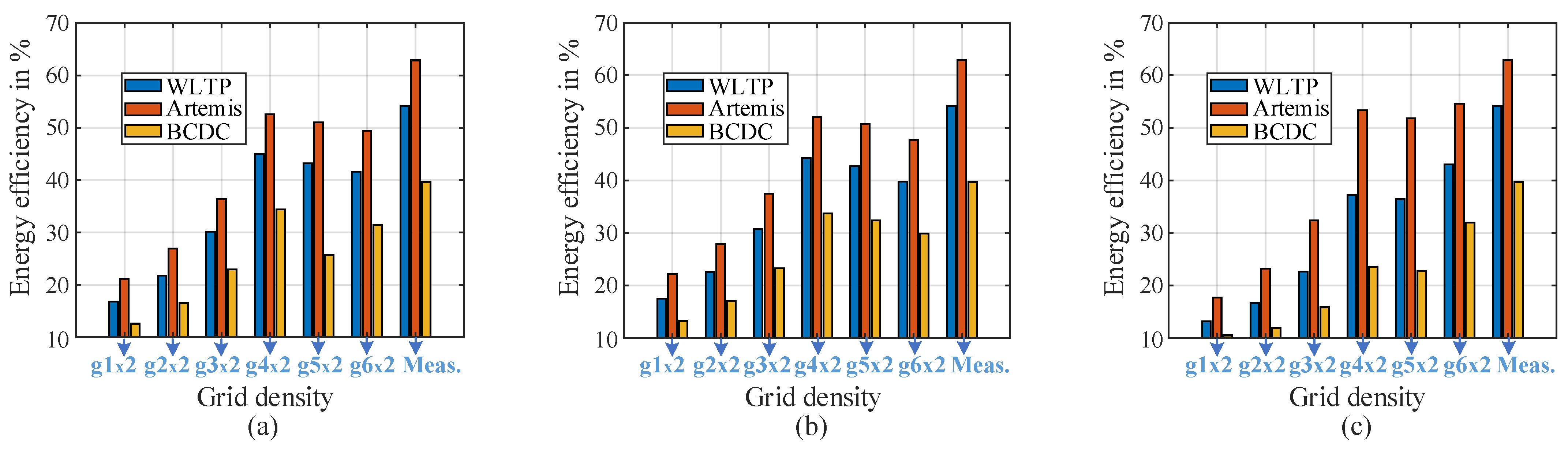 Figure 11. Total input energy measured or simulated during down-scaled WLTP drive cycle (with BMW i3) operation using different approaches. For the steady-state efficiency-map-based analysis, results are presented only for the optimal grid density identified among the grid densities evaluated.