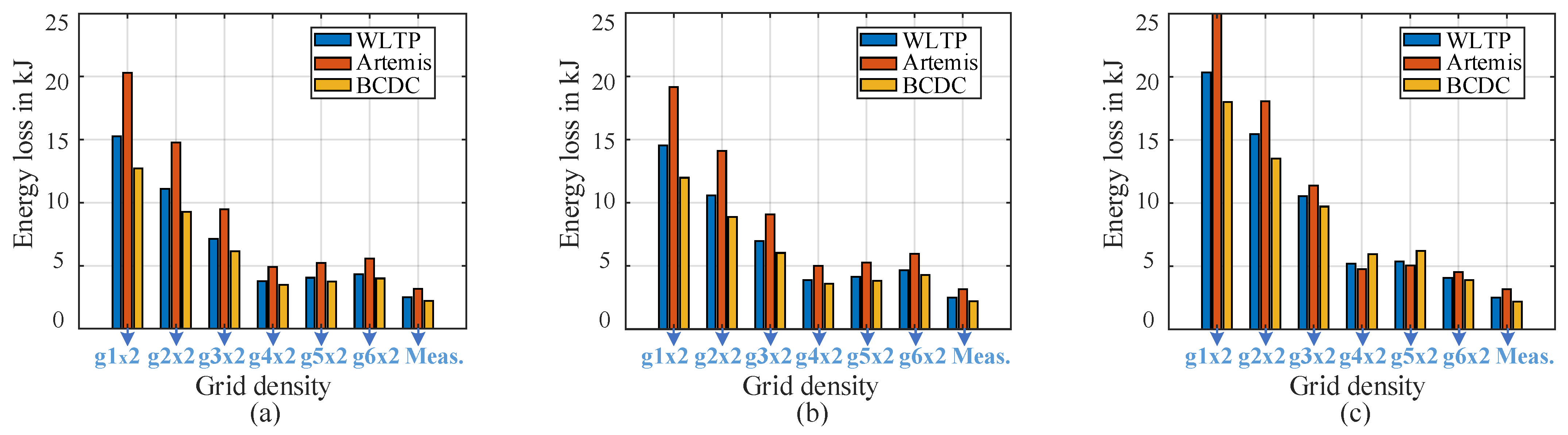 Figure 10. Influence of the no. of grid points on the efficiency maps’ predictive performance. The figures show the energy loss ( W in, map W out, cycle ) of the drive cycles as determined from efficiency maps and by direct time-stepping measurements in the laboratory ( W in, meas W out, cycle ) , all for the mid-size car (BMW i3). Efficiency maps as LUTs are constructed for different torque–speed grid points (grid × 2 meaning motoring/generating regions, respectively) using (a) FEA method, (b) Analytic method, (c) Experiment method. Drive cycle total input energy ( W in, meas ) as measured in the laboratory: WLTP = 5.46 kJ, Artemis = 8.53 kJ, and BCDC = 3.65 kJ.