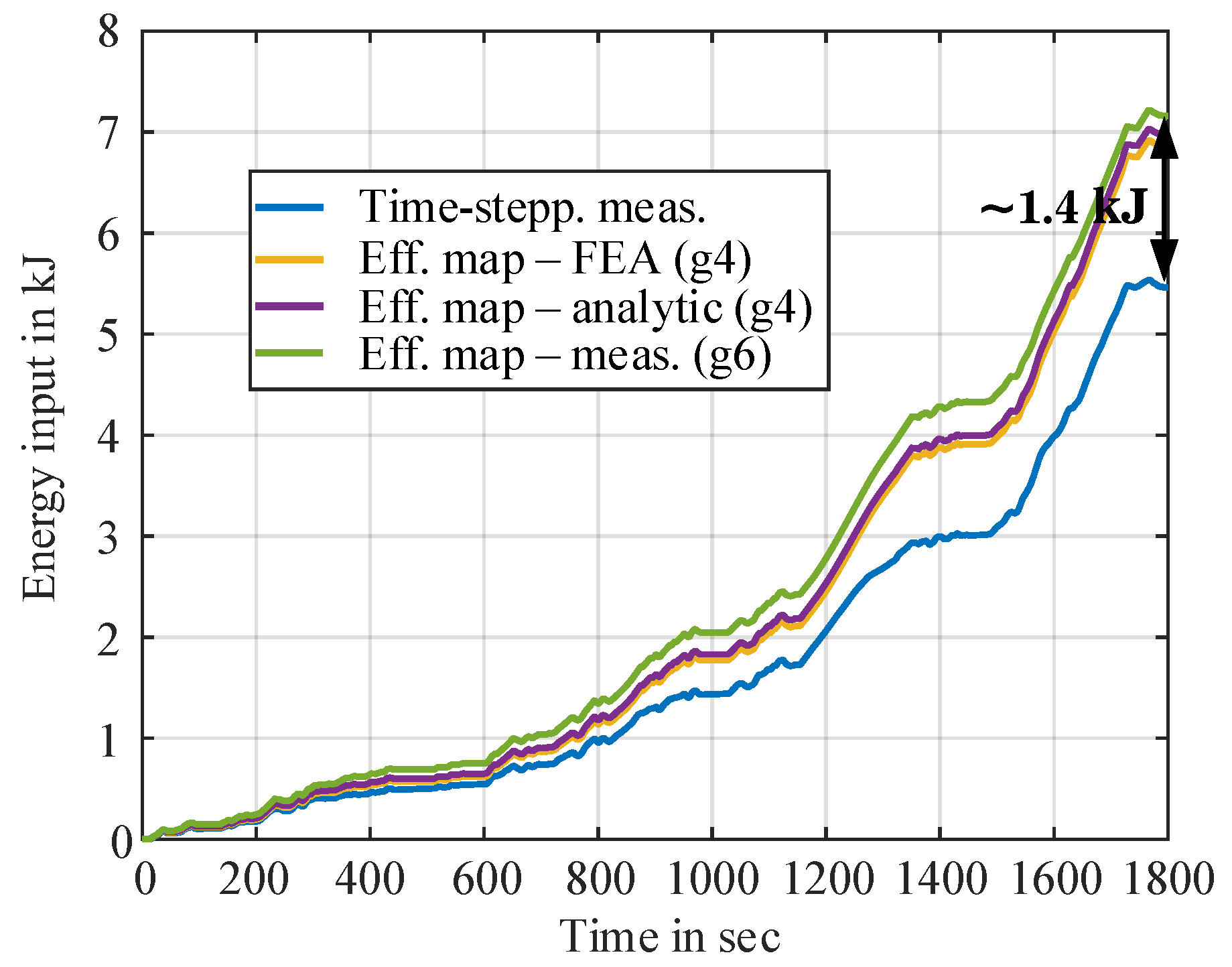 A visual representation of the total input energy-time profile during PMSM drive cycle operation (down-scaled WLTP with BMW i3) computed using both approaches (efficiency map and time-stepping) is presented in Figure 11. As it can be seen, the efficiency-map-based approach consistently overestimates the required electrical input energy. The total input energy difference between two approaches is around 1.4 kJ for WLTP drive cycle (with BMW i3), which is roughly 26% of the input energy obtained from direct time-stepping measurements. For all studied down-scaled drive cycles, this difference varies between 20% and 30%.