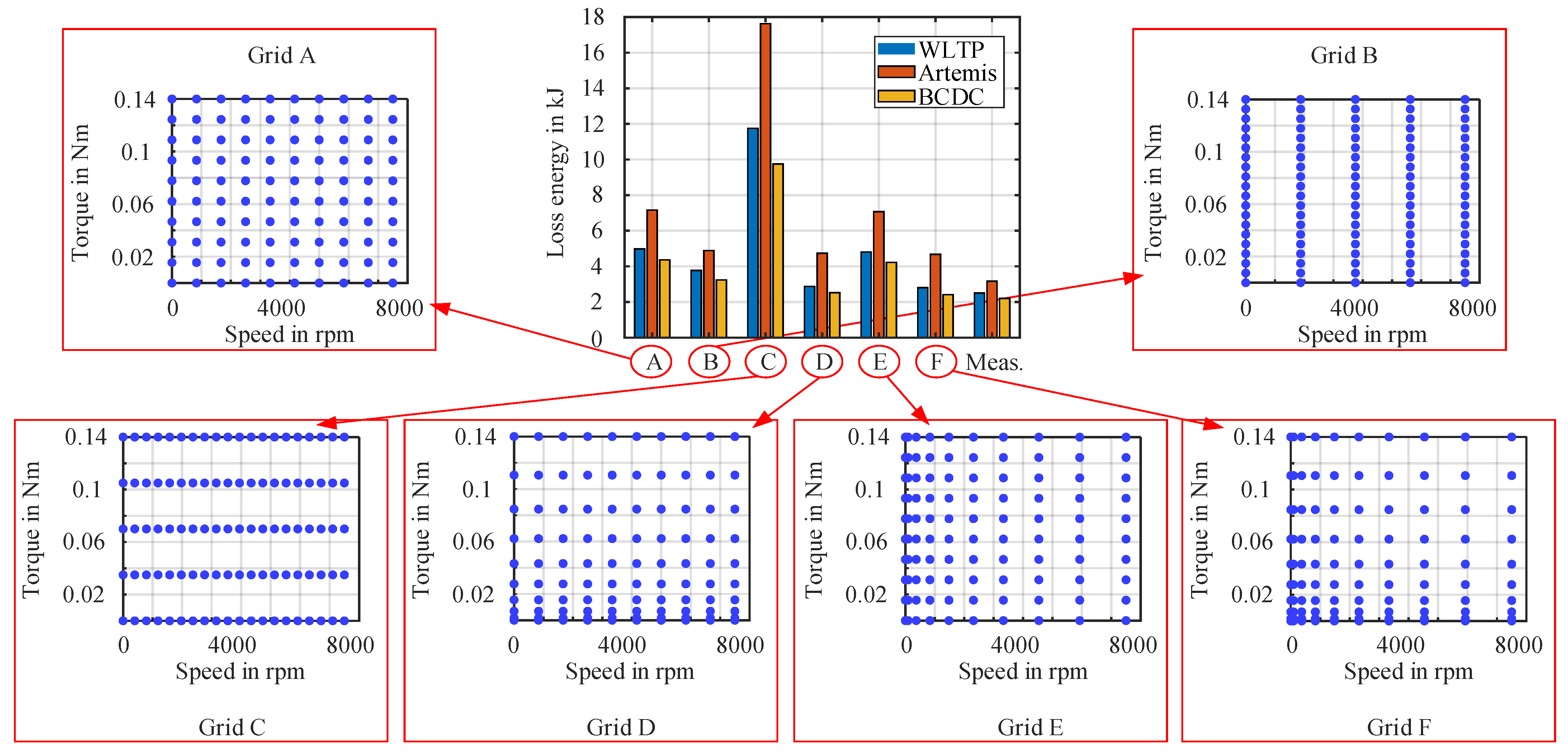 Figure 12. Quantification of interpolation effects associated with torque–speed grid points under different placement strategies. Plot shows loss energies ( W in W out ) of different down-scaled drive cycles (with BMW i3), obtained from map-based analyses using various grid points placement and from direct time-stepping laboratory measurements.