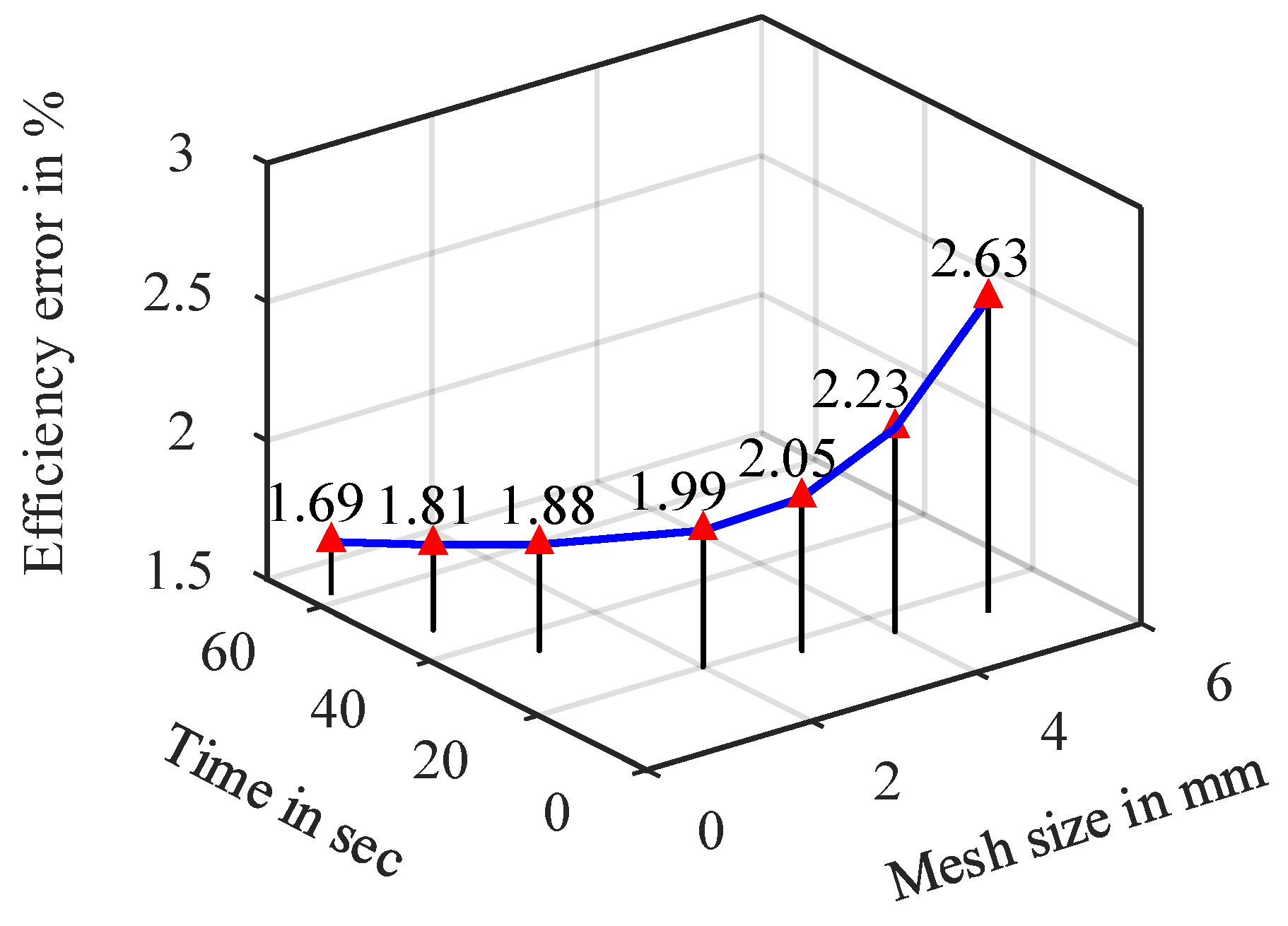 Figure 13. Quantification of the FEA model in terms of mesh size, computational time, and accuracy for evaluating the performance of a PMSM OP. The results are obtained from simulations at an OP with a torque of 0.042 Nm and a speed of 1800 rpm.