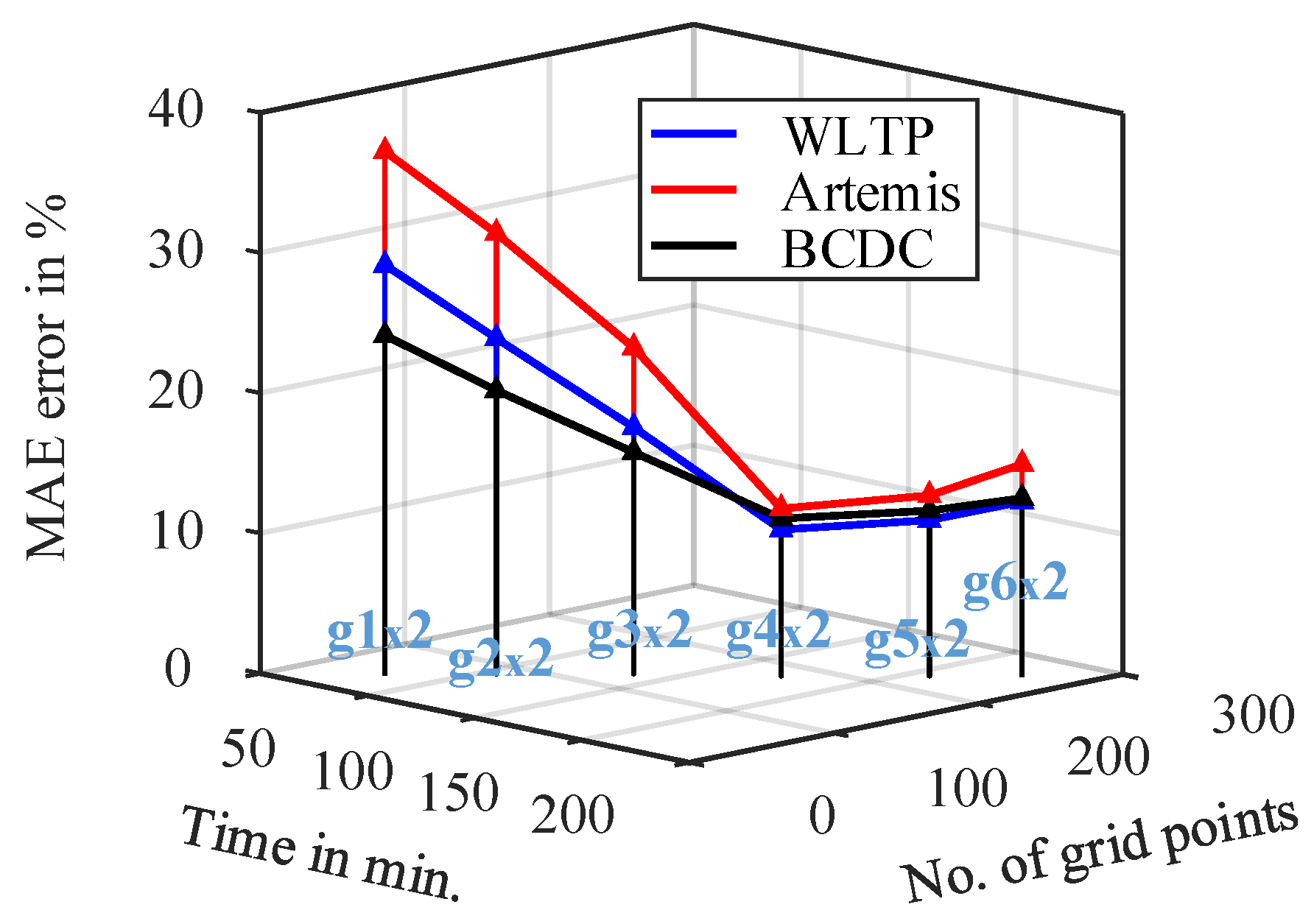 Additionally, the distribution of the grid points significantly influences the drive cycle performance predictions, with variations of up to one-third compared to transient measurements, depending on the chosen grid configuration. Furthermore, in the case of the steady-state methods, the differences between the reference and measured grid points also contributed to the identification of a different optimal grid density.