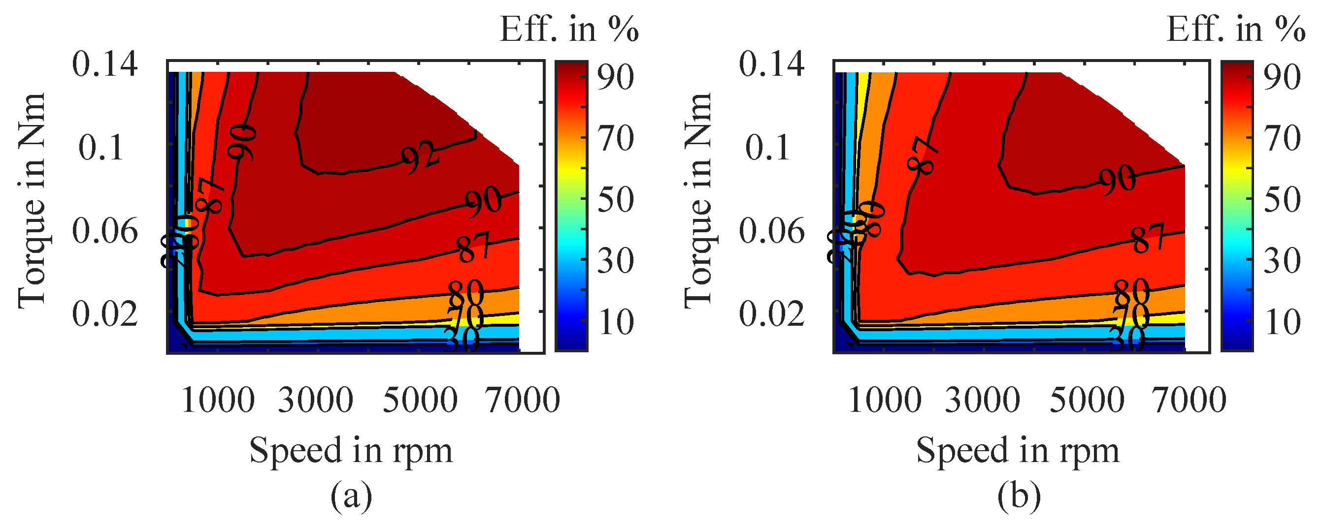 In both simulation methods, copper, iron, and mechanical losses are considered. Additional losses such as those in the magnets and the converter (e.g., PWM switching and conduction losses) are excluded, as their influence on the overall results is considered of minor importance in the context of this study. Details of both the analytic and the FEA model are also published; see [27,36,38]. All simulations and measurements are conducted at room temperature.