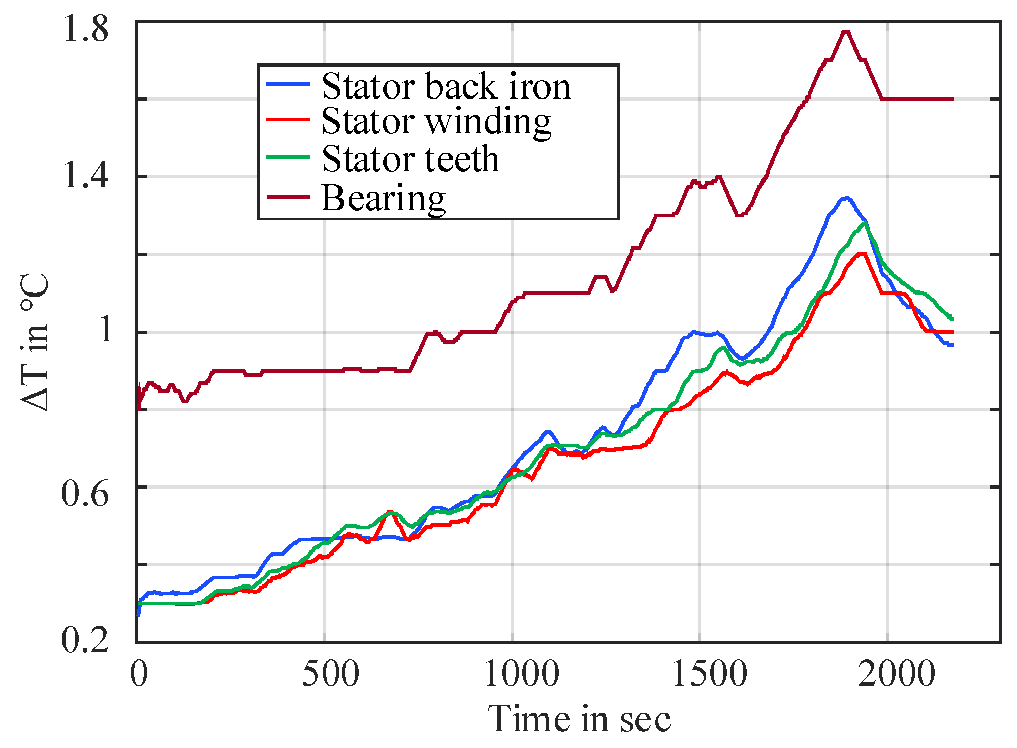 Figure 16. Measured temperature rise ( Δ T ) of selected parts of the laboratory PMSM during down-scaled WLTP drive cycle (with BMW i3) operation.
