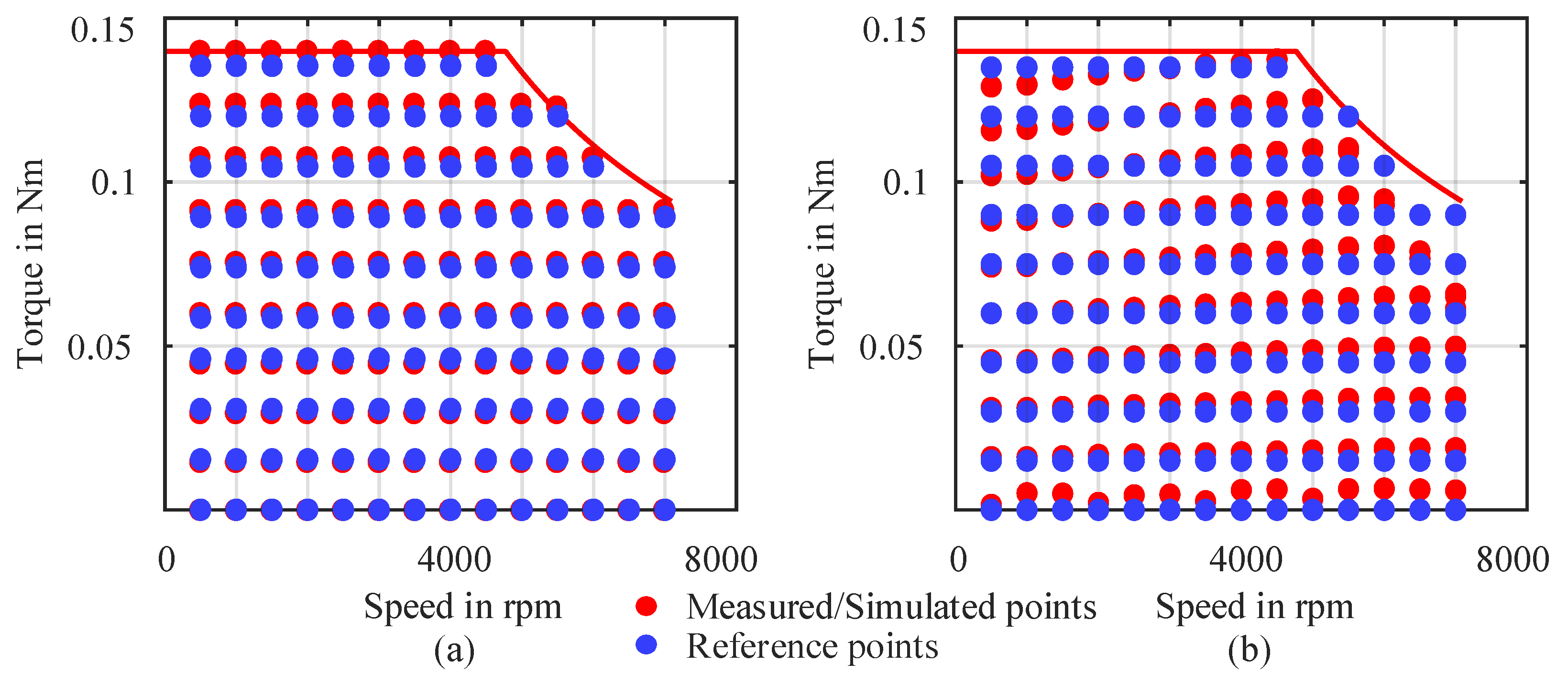 Figure 17. Visual difference between the reference and measured/simulated torque–speed OPs for steady-state efficiency map approach with (a) FEA method, (b) Experiment method. An example case of 130-point grid (g6) is presented.