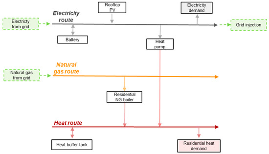 Figure 2 involves three energy vectors (electricity, natural gas, heat) and three energy supply sources: grid-supplied electricity and natural gas, along with electricity generated by high-efficiency rooftop PV panels. The model incorporates two conversion technologies (air/water electric heat pump and a residential gas boiler) and two storage technologies (Li-ion battery and heat buffer tank). The energy requirements of the system include electricity consumption and SH and DHW demands.