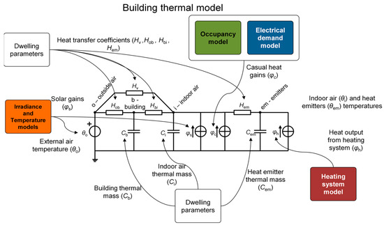 The grey box model is composed of 3 capacities representing the thermal inertia of the building envelope, the indoor air, and the heating/cooling appliances, respectively. It also includes 3 heat transfer coefficients to represent the transfers from the ambient air to the building envelope, then to the indoor air, and finally, to/from the heating/cooling appliances. A fourth coefficient simulates losses associated with air movement. Four heat sources/sinks account for the exterior, the solar gains, the casual heat gains (inhabitants, appliances, lighting, and hot water tank losses), and heating.