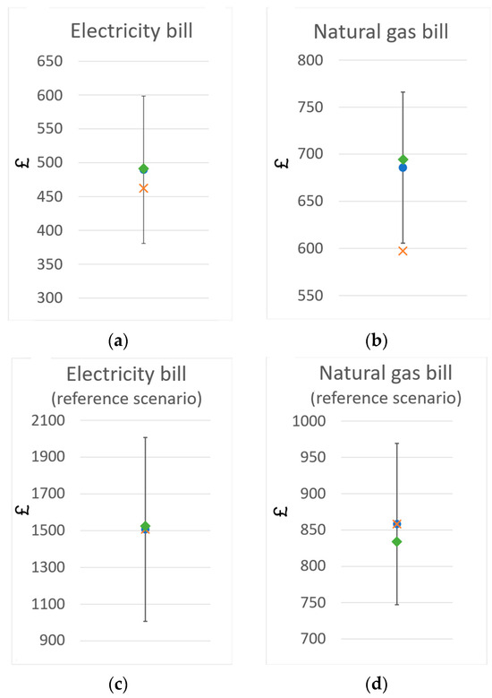 Figure 8c,d show the electricity and natural gas bills of the reference scenarios, respectively.