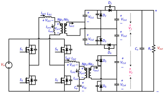 Despite these advancements, the high-step-up gain characteristic remains a critical feature—especially for applications like EBW—where the ability to achieve substantial voltage transformation efficiently is paramount. In this context, the present study proposes a novel topology featuring a combined half-bridge and full-bridge transformer with integrated VMCs on each secondary side, as depicted in Figure 1. Compared to the conventional PSFB converter, this configuration extends the lagging switches’ ZVS range by leveraging the magnetizing current of both transformers, eliminating the need to increase leakage inductance. The resonance between the voltage-doubler capacitors and the full-bridge transformer’s leakage inductance significantly reduces the current stresses on the voltage-quadrupler diodes during switching intervals. Notably, the resonant frequency () of the half-bridge section is tuned to achieve ZCS for the voltage-doubler diodes, thereby decreasing current flowing through the primary side. This yields substantial RMS-current reduction and lowered conduction losses relative to the conventional PSFB. Furthermore, the suggested converter achieves approximately five times higher voltage gain relative to a standard PSFB, making it an ideal candidate for high-boost and high-voltage applications requiring exceptional efficiency and performance.