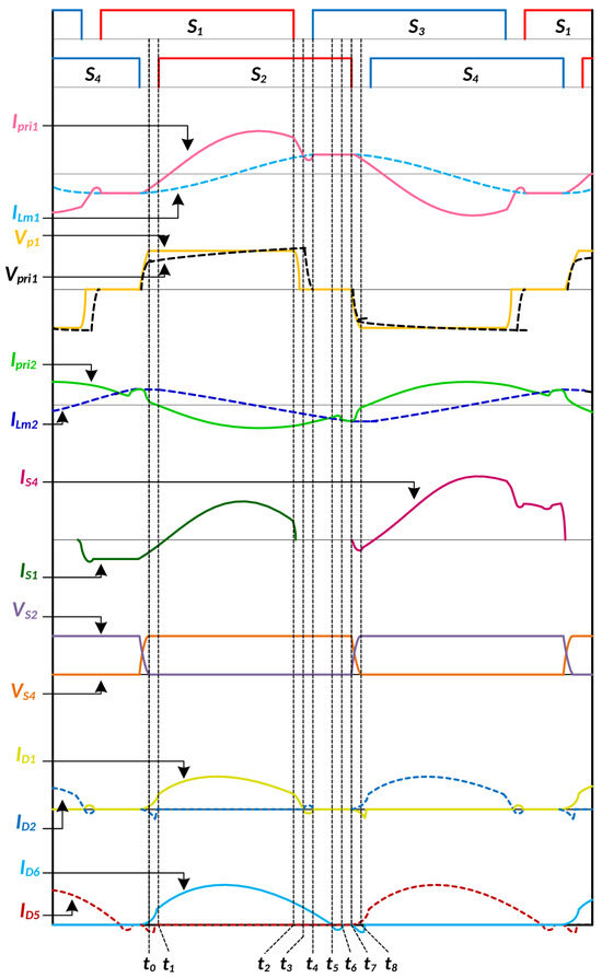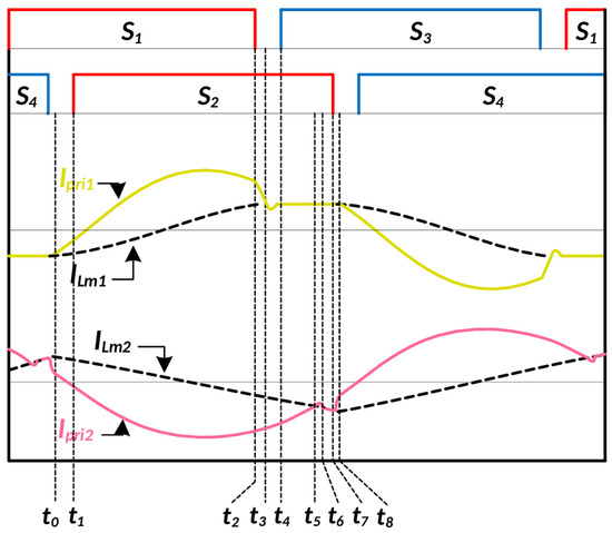 Due to the energy stored in the large output filter inductor of a conventional PSFB converter, ZVS of the leading-leg switches is readily achievable. However, the lagging-leg switches exhibit a narrow ZVS range, as their operation depends on the energy stored in the leakage inductor. This energy is often insufficient at light loads to fully charge and discharge the junction capacitors of the lagging switches. To overcome this limitation in the proposed converter, when turns off, exceeds , as shown in Figure 6. Consequently, the energy stored in the leakage inductor at must exceed the energy stored in the output capacitors of and to realize ZVS for the leading-leg switches. Although this is often insufficient by itself, the energy stored in the magnetizing inductor at additionally contributes to the ZVS of these switches. Therefore, Equation (26) must be established to satisfy ZVS conditions for and :