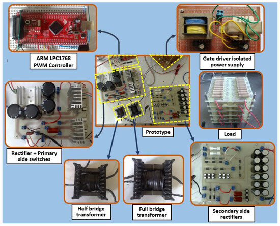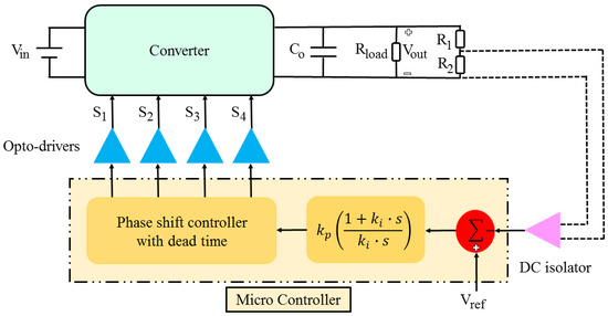 Figure 1 and Figure 2 illustrate the circuit diagram and the steady-state operating waveforms of the suggested converter. Its operational principles are divided into two symmetrical parts, with the first half-cycle described as follows. It is assumed that the capacitances and are significantly larger than and . Additionally, the voltage-multiplier capacitor is assumed to be much larger than , where is referred to the primary side. The duty cycle (D) is taken as 0.5, which indicates that each switch is driven for half of the switching period. The is established by the interaction between the leakage inductance of the HB transformer and the reflected voltage-doubler capacitors. The switching frequency () is maintained close to this . The converter’s control schematic is shown in Figure 3. Initially, the output voltage is sampled using two resistors. The sampled signal is then applied to an isolated DC interface. The isolated signal is fed into an LPC1768 microcontroller, which compares it to a reference to produce an output error signal. This error is processed by a PI controller, whose parameters are implemented in the microcontroller. Finally, the microcontroller adjusts the phase-shift command to the extent determined by the PI controller. The appropriate dead time for the leading and lagging branches has been implemented in the microcontroller. Ultimately, the microcontroller generates four pulses, which drive the optocouplers; the optocoupler outputs then convert these into gate pulses for the converter’s MOSFETs.