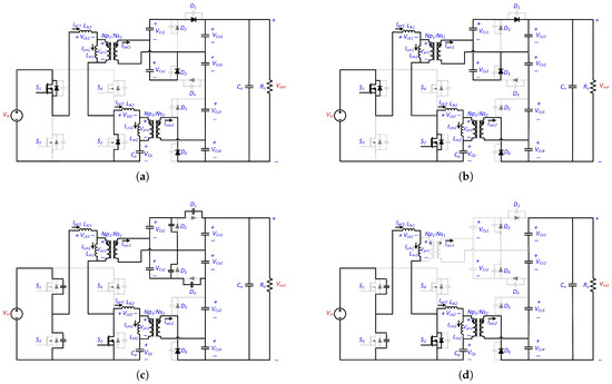 According to the half-bridge LLC converter analysis in [31], the voltage gain of this HB section remains nearly constant under varying load conditions, implying that is steady. Consequently, and added together make up the total output voltage, with voltage regulation achieved by controlling through phase-shifted switching techniques. The operating modes of the system are illustrated in Figure 4, with each mode’s performance described as follows.