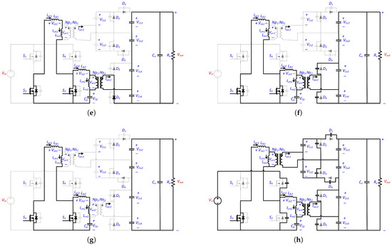 Operating circuits of the suggested converter during a half-switching cycle: (a) Mode 1, (b) Mode 2, (c) Mode 3, (d) Mode 4, (e) Mode 5, (f) Mode 6, (g) Mode 7, and (h) Mode 8.