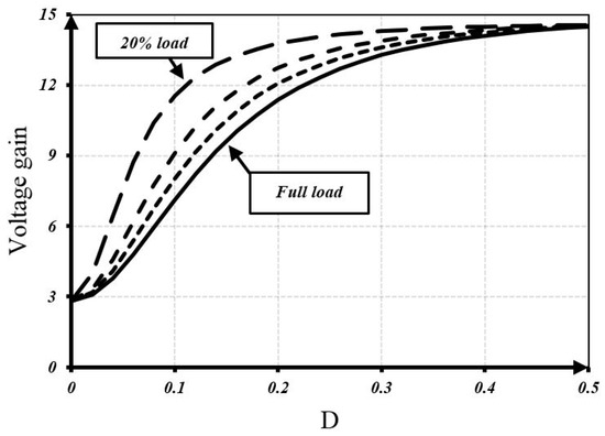 By combining Equations (17) and (24), Equation (25) is obtained, which expresses the voltage gain of the proposed boosting converter. To assess the voltage efficiency of the proposed converter under varying load, Figure 5 is presented. The figure shows the load variation ranging from 20% to 100% of the nominal load. As observed, the duty cycle on the horizontal axis varies from 0 to 0.5, with the maximum voltage gain occurring at 0.5 and the minimum at 0.
