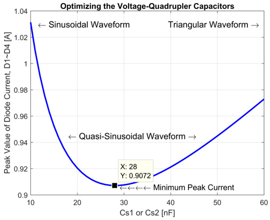 If the voltage-doubler capacitors (or the equivalent capacitor in the doubler network) are increased to around 100 nF or more, the switching frequency must be reduced to maintain ZCS, which would degrade the overall power density—unfavorable for high-power applications. Therefore, not every capacitor value is suitable to achieve ZCS. In practice, capacitor values tend to be in the nanofarad range, typically around 1 to 30 nF. A balanced operating frequency around 70 kHz was selected, which led to the identification of a capacitor value of 12 nF conducive to achieving ZCS. For the quadrupler configuration, the objective was to minimize the peak current through the diodes. To achieve this objective, Figure 8 illustrates the optimized capacitor value for the voltage-quadrupler.