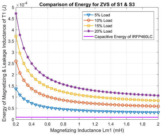 Required energy for ZVS of the lagging–leg switches under variations in load condition and value ( = 1.2 mH).