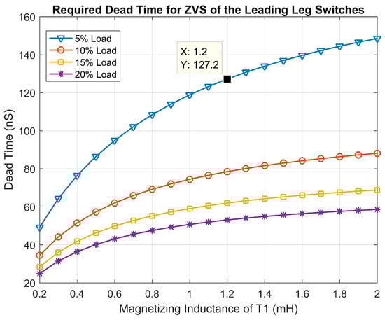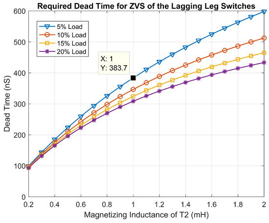 Required dead time of the lagging-leg switches under variations in magnetizing inductor of the HB transformer and load condition ( = 1.2 mH).