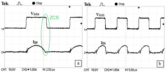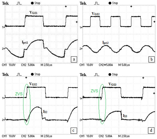 To validate the effectiveness and performance of the suggested converter, a 500-W prototype is built and tested according to Figure 13. The specifications of the converter are input voltage = 150 V, output voltage = 2 kV and switching frequency = 71 kHz. The values and parameters of the equipment employed in the converter are listed in Table 1. For simplicity of the analysis, the secondary turns of both transformers are taken equal to the primary turns, i.e., a turns ratio of 3 ( = = 3). Accordingly, Figure 14 shows the specifications of the primary currents of Transformers 1 and 2 ( and ) and the currents through switches 2 and 3 under full load conditions. Figure 15a,b illustrate the ZVS operation of the main switches at full load. ZVS at 5% load is achieved by leveraging the inductive energy and adjusting the dead time accordingly. Figure 15c,d display ZVS of the main switches at 5% load, demonstrating that the converter maintains ZVS from no load up to full load. Furthermore, as shown in Figure 16, the experimental results verify the ZCS of the voltage-doubler diodes. As a consequence of quasi-sinusoidal operation, the turn-off current stress on the voltage-quadrupler diodes is significantly reduced compared to their triangular-waveform counterpart.