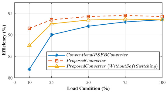 The measured efficiency of the 500-W prototype, in comparison to a conventional PSFB converter, is illustrated in Figure 17. The peak efficiency attains approximately 94.5% at 75% load. Notably, the efficiency gains are even more pronounced at light loads below 25%, primarily thanks to the ZVS operation of lagging-leg switches. The absence of an output inductor also contributes to efficiency improvement. To evaluate the performance of the converter in both soft-switched and hard-switched operation, the impact of soft switching on converter efficiency is presented. The proposed converter demonstrates near-constant efficiency across a wide range of load variations, even under severe loading conditions. This characteristic implies that the device maintains robust performance without a priori limitations across diverse load ranges.
