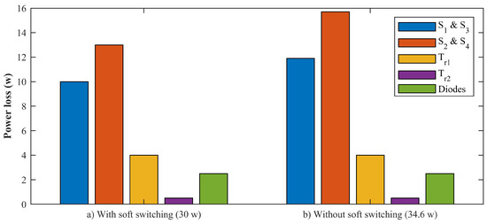 Power loss of the prototype under full load: (a) with soft switching, and (b) without soft switching.