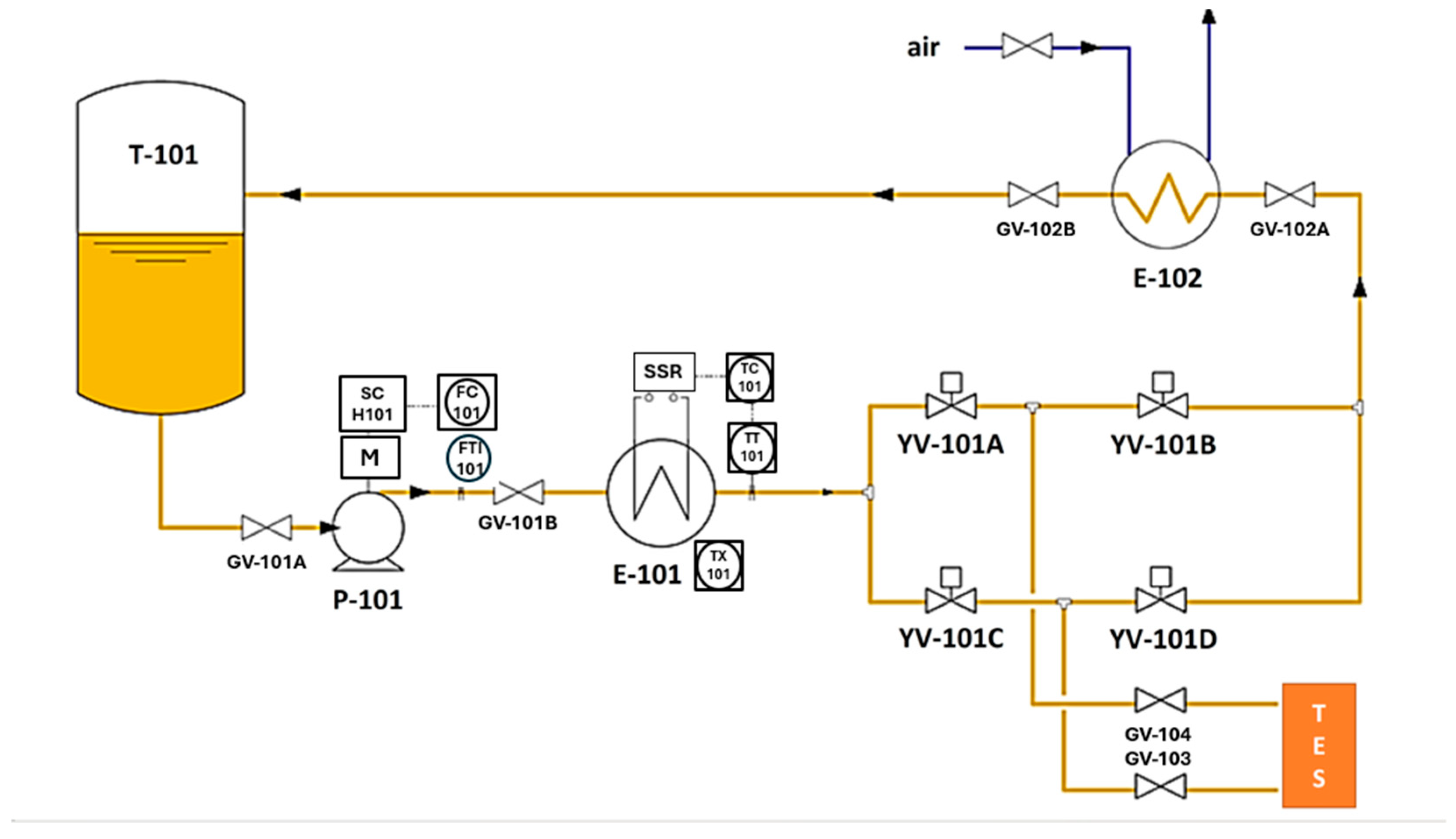 - An electric heater (E-101) with a power of 21 kWth, which allows the oil entering the TES to be heated to the desired temperature, provided it is below a set value (approximately 340 °C).