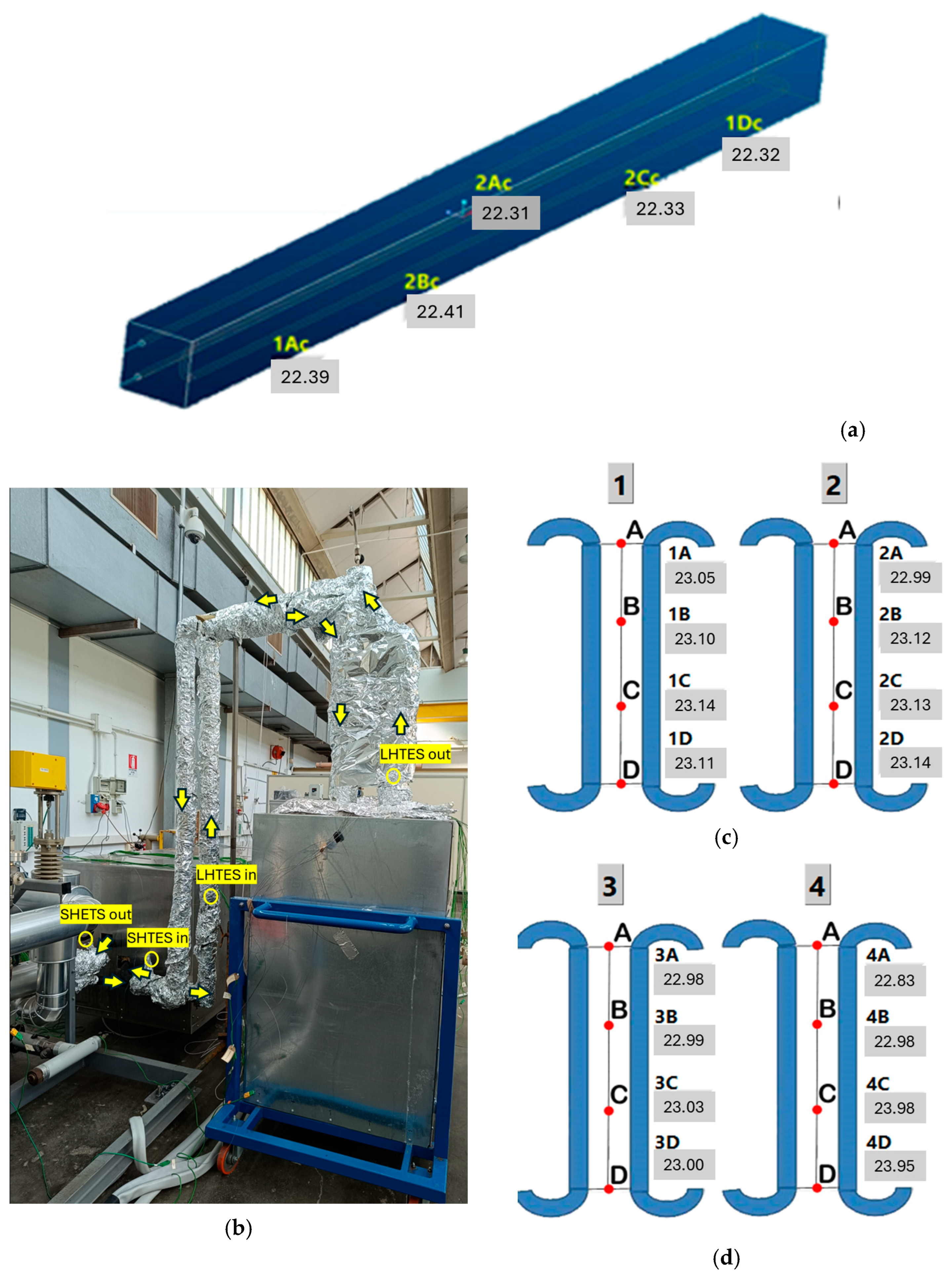 - 16 on an iron mesh installed within the PCM. They are located at equal distances between the vertical exchanger tubes installed in the LHTES (Figure 6c,d). The thermocouples are arranged across 4 different heights on 4 parallel rows of tube. Specifically, Figure 6c illustrates the thermocouples installed among the inner tube bundles (number 1 is on the right and 2 on the left), while Figure 6d shows the more peripherical ones (number 3 is on the right and 4 on the left); the letters A, B, C and D in the Figure 6c,d specify the vertical positioning of the thermocouples.