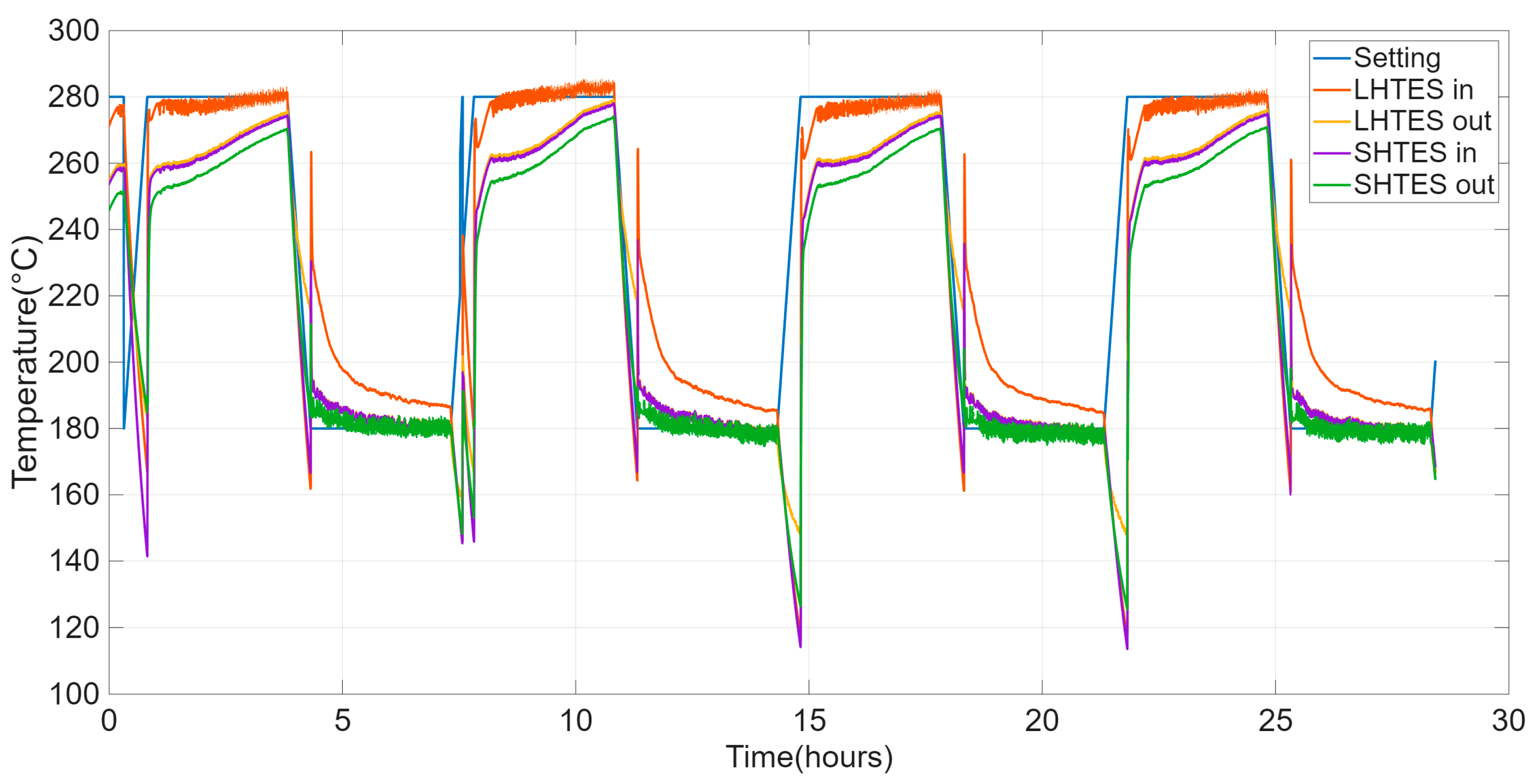 - The cyclic tests have shown that more than four complete charging/discharging cycles are necessary to stabilize the thermal behavior of the system;