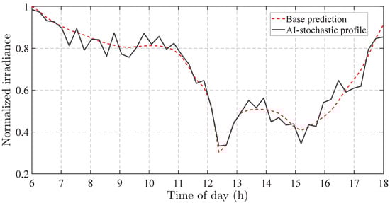 Comparison of the base irradiance prediction and the AI-stochastic profile.