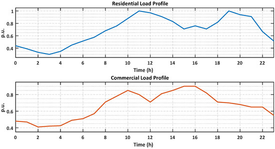 Typical daily residential and commercial load profiles in per-unit values, showing that residential demand peaks around midday and in the evening, while the commercial profile exhibits a broader and sustained peak throughout working hours.