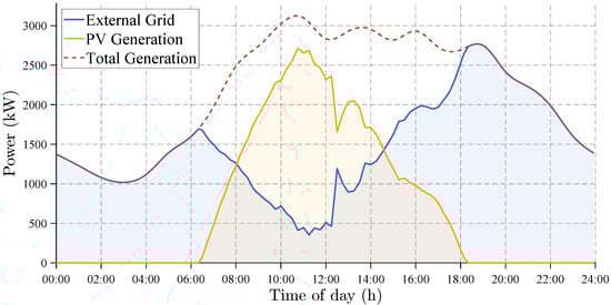 Figure 6 shows the hourly generation profile of the external grid in the presence of photovoltaic power injection over a typical day. It can be seen that the interval of highest solar irradiance occurs between 10:00 a.m. and 12:00 p.m. During this time, photovoltaic generation reached a maximum value of 2711 kW, representing approximately 86% of instantaneous demand. In terms of energy balance, the photovoltaic system achieved a total daily production of 17,626 kWh. In comparison, the total energy demand recorded was 55,720 kWh, indicating that PV generation accounted for 31.6% of the demand, a significant contribution to the system’s supply.