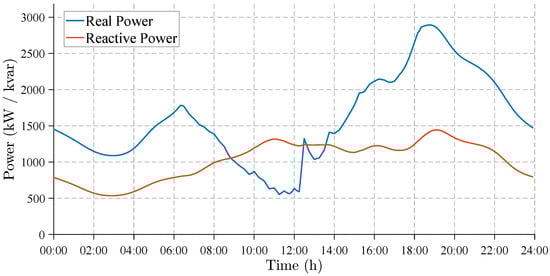 The daily profile of active and reactive power delivered by the external grid is shown in Figure 7, which indicates a gradual reduction in active power between 8:00 a.m. and 3:00 p.m. due to the increased participation of photovoltaic generation during that interval. Furthermore, during the hours of highest irradiation, photovoltaic generation reduces the active power requirement from the grid, leading to reactive power demand exceeding active power demand.